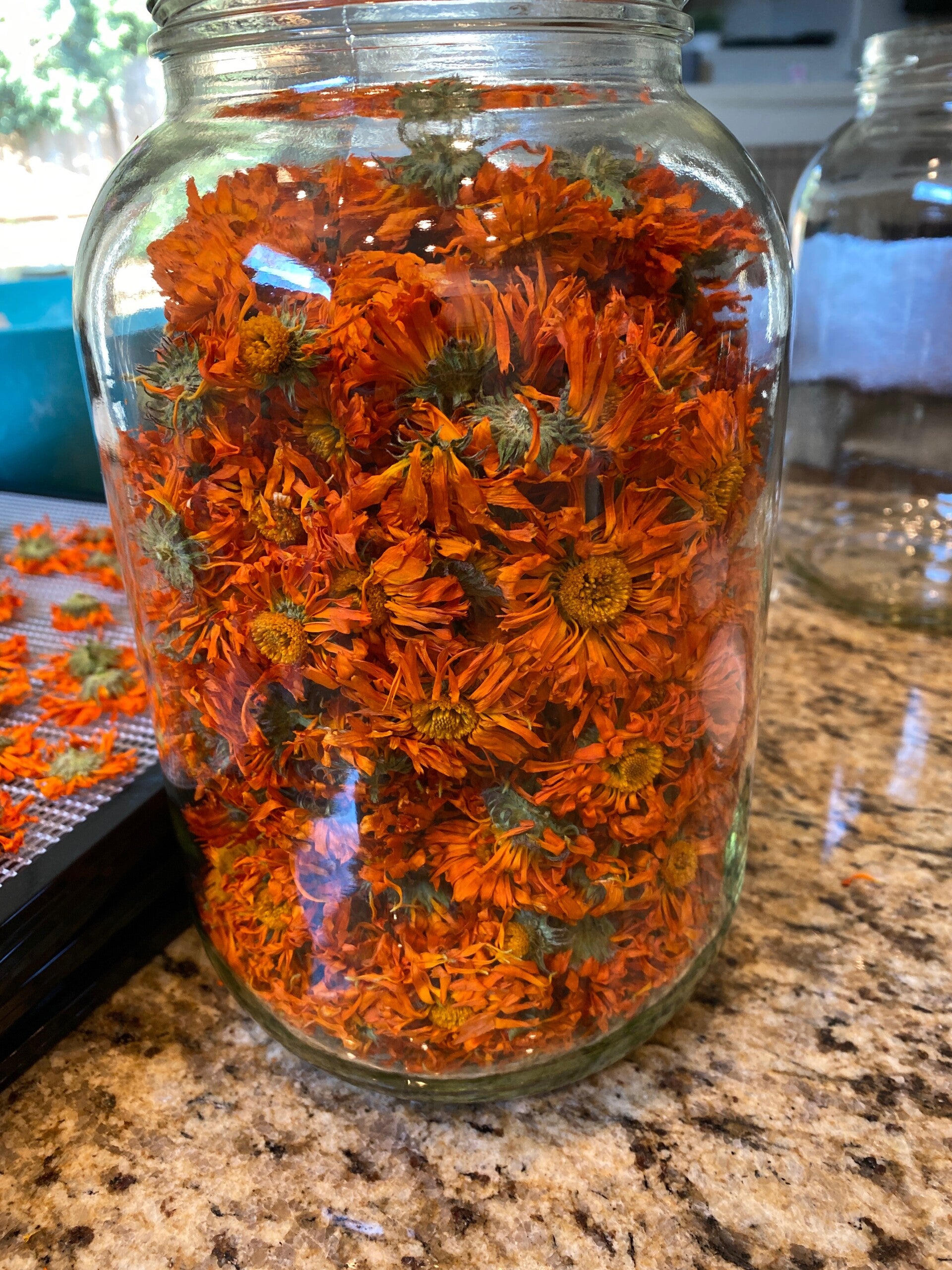 To make the best salve starts with the best ingredients that you can find. This does not necessarily mean the most expensive, but rather the cleanest, locally grown plants that you can find. Something from the edge of a meadow perhaps, rather than the side of a busy road! Let's take calendula - going outside on a clear sunny morning, looking for the open flowers that seem to capture the day's sunshine. Snip the top of the plant and collect in a basket. Despite the colorful pictures that seem to appear everywhere on the internet with fresh calendula blossoms in a jar, you are best served with drying your blooms first. No special equipment needed, just a space to dry them and a little time. Once you have a sufficient amount, and the blossoms are dried it is time for the magic to happen!